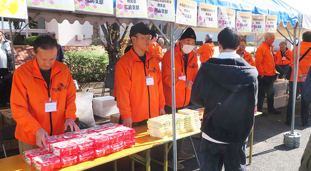 当日は、B号館前に校友会テントを張り、全国11支部から役員が集まりました。模擬店では、高知支部の新米の販売、石川支部のサツマイモ詰め放題、あんぽ柿、干し芋、焼き稲荷の販売が行われました。また、福岡支部を中心に「懐メロ歌謡曲ドレミファドンゲーム」が行われ大変盛り上がりました。