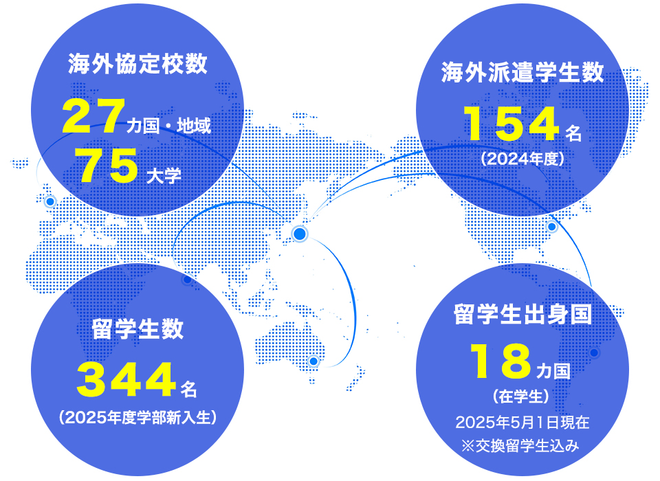 本学では、世界27か国の大学・教育機関と協定を結び、グローバルな学びのネットワークを展開しています。留学生の受け入れと学生の海外派遣の両面から、国際的な人的交流を活発に推進しています。