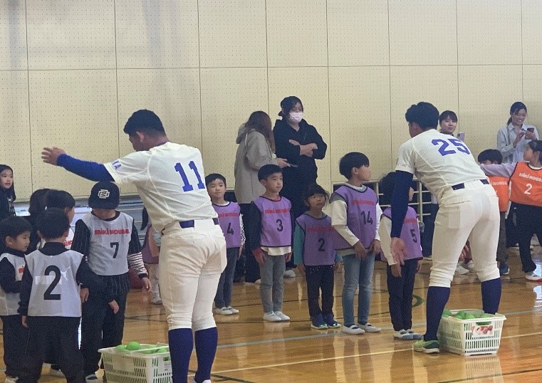 2025年11月30日(日)、八尾市南木の本防災公園体育館にて、地元地域の未就学児を対象とした野球教室(第9回キッズ・ボールパークin八尾)を開催しました。300名を超える応募者の中から抽選で選ばれた160名が、午前・午後の部に分かれて参加頂きました。当日は、元オリックスバファローズのコーチ陣に加え、本学硬式野球部員8名及びマネージャー1名がスタッフとして運営を担当しました。プログラムは午前・午後の2部制で、ボールの投げ方や打ち方をはじめ、ゲーム形式でのティーボールやミニゲームなどによって、スポーツの楽しさや野球の面白さを知ってもらう良い機会となりました。