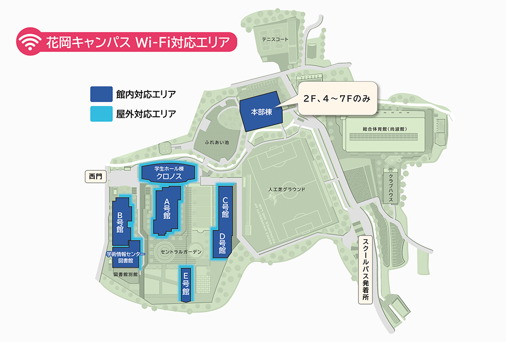 キャンパス内では、学生・教職員は各自の所有する機器(ノートパソコン・タブレット端末・スマートフォン等)をWi-Fiに接続して、自由に利用することが可能です。