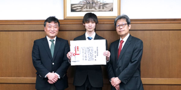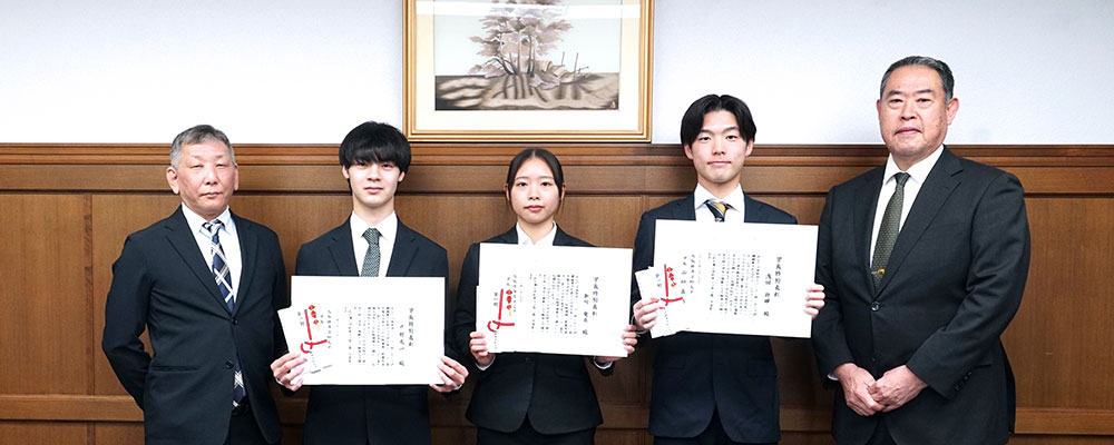 大阪経済法科大学学則第33条に基づき、学術および課外活動において顕著な功績があり、他の学生の模範となる4名が表彰され、山垣真浩学長から賞状と副賞として金一封が奨学費として授与されました。