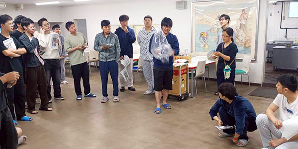 訓練終了後、訓練内容の再確認と理解定着を図るため、寮管理人がマニュアルを用いた座学を行い、避難経路や集合場所、安否確認の手順について改めて復習を行いました。