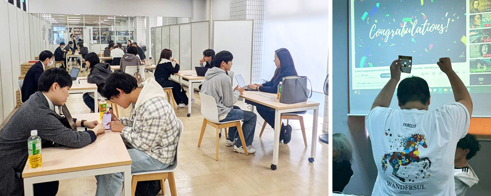 個人面談の順番を待つ間は、先輩学生たちが準備した交流会でゲームやビンゴ大会に興じ、皆満面の笑顔。互いの距離をぐっと縮め、絆を深めました。