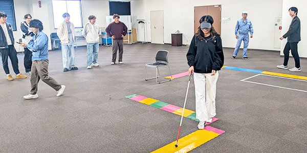 ワークショップでは、学生たちは目隠しをした状態で、ゴム製誘導マット「歩導くんガイドウェイ」でつくられた誘導路を歩き、視覚障がい者の方にとって誘導マットがどれほど重要な役割を果たしているかを体験しました。誘導マットの重要性は想像することはできても、実際にそれを頼りに歩く立場になってみなければ気付かないことも多くあります。