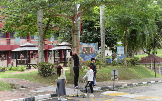 23日(月)には早速、学生間の交流活動が行われました。UKMの学生からは、マレーシアの伝統文化の一つであるLayang-layang(ラヤン・ラヤン:マレー語で「凧(カイト)」の意味)についての説明があり、彼らの手ほどきを受けて実際にラヤン・ラヤンを手作りし、飛ばしてみました。