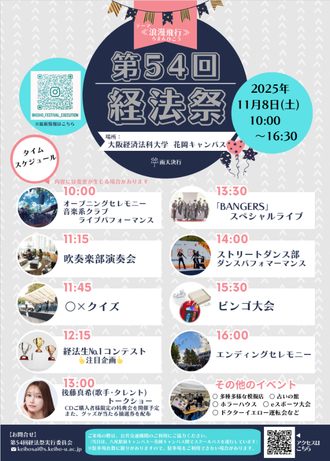 ※雨天時などは、イベント内容や会場を一部変更する場合があります。最新情報は、経法祭公式インスタグラムで随時お知らせいたします。