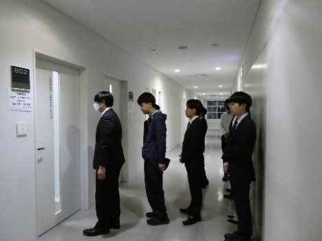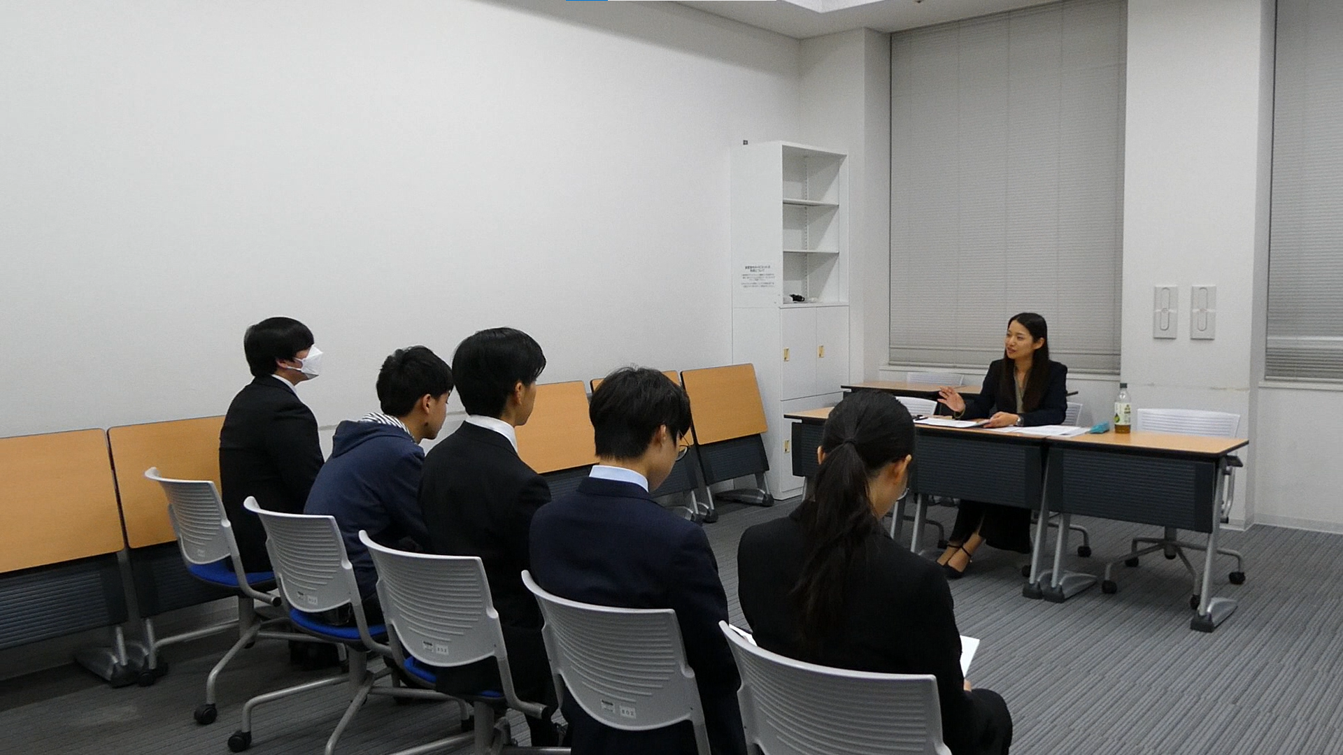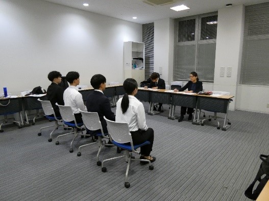 集団模擬面接では、実際の面接試験を想定し、「自己PR」「学生時代に力を入れたこと」「志望動機」といった“面接の三大質問”を中心に練習を行いました。