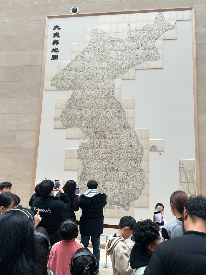 館内では展示を自由に観覧しながら、それぞれがフィールドワークのミッションを選んで展示物や空間を観察記録しました。今回は、1階ロビーに新しく展示された全長約6.7メートルの《大東輿地図》(1861年に金正浩が完成した、朝鮮全土を描いた地図)も注目を集めていました。ある学生は、《半跏思惟像》が展示されている「思惟の部屋」について、星空のような空間の中で仏像に見入るうちに、「自分自身と向き合っているように感じた」と振り返りました。この学生の感想は、ミュージアムとは「作品を見に入ったはずが、結局は自分自身と向き合って出てくる場所」であると語った、ある美術史家の言葉を思い起こさせます。時代を超えて伝わる作品をじっくり観察し、歴史や文化への想像力を深める貴重な学びの機会となりました。