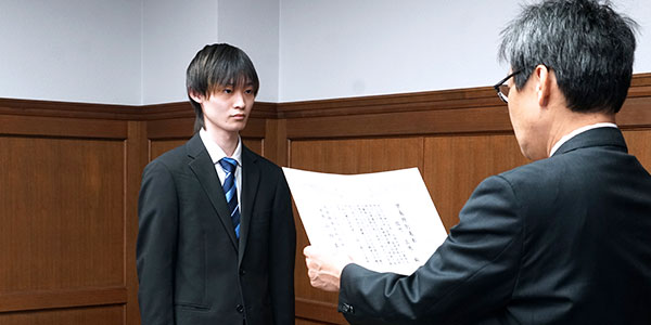 大阪経済法科大学学則第33条に基づき、学術および課外活動において顕著な功績があり、他の学生の模範となる4名が表彰され、山垣真浩学長から賞状と副賞として金一封が奨学費として授与されました。